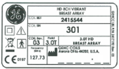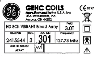 To identify the 3.0T HD Breast Array Coil, refer to the coil label (see the following illustrations).