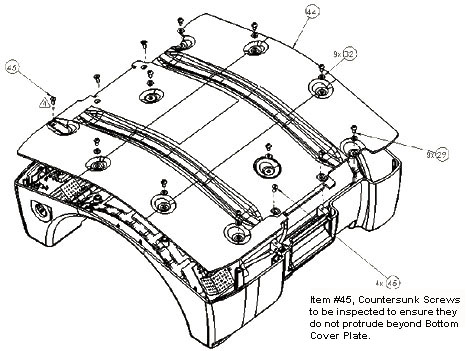 Fix the new bottom cover plate (2380715, supplied in FRU kit) with nylon screws and brass screws. Ensure free movement of the latch assembly.