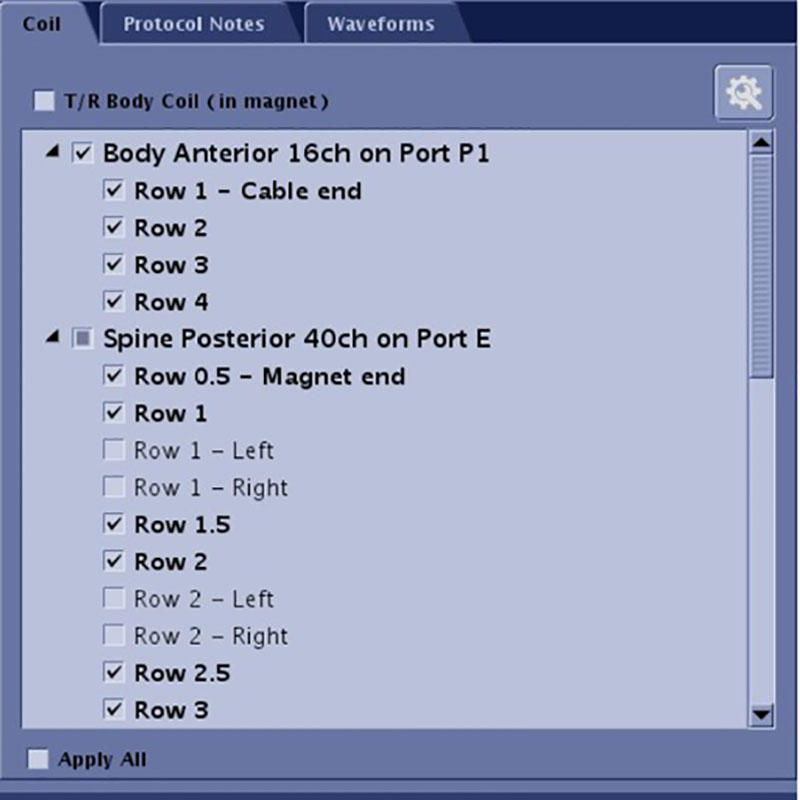 A dynamic clinical coil configuration includes a local (imaging) coil mode and full coil mode.The full coil mode is dynamically generated using all of the possible Receive Element Groups (REG)s contained in the coils that are connected, enabled by the user, and that can be acquired simultaneously. The full coil mode is used by the auto coil calibration in prescan to determine sensitivity data for all coil elements. REGs used in the full mode are stored in the DICOM tag (0043, 10C1).