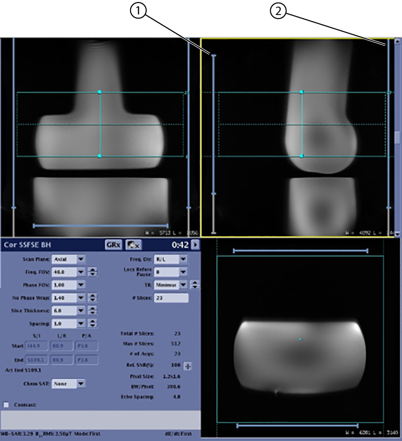 Extent lines will not appear until after the prescan completes for the currently selected coils and table location. Gray extent lines show the extent of the entire coil and blue lines show the extents of the selected elements.