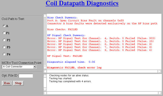The coil connector test validates each connector separately by connecting the proper adaptor cable to the MCRv tool and running the indicated test below. The test validates both the signal (RF) path and the control (DC) path for that connector.