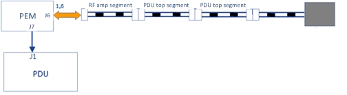 Opening any of the connections between line segments, however, causes the Auxiliary board or PEM to latch into failing state whereby an error is logged and scanning is inhibited. Opening a line segment does not result in PDU main breaker trip. Recovery from latched state is only possible by reconnecting segments and then cycling power to the Auxiliary board or PEM (Gradient 48V Control on front of PDU).
