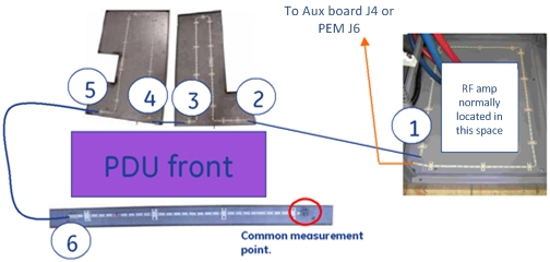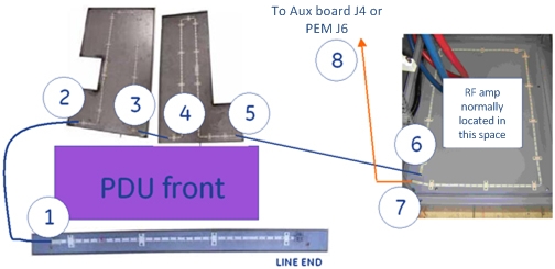 Leak detection consists of a series of cable segments positioned in different areas of the PGR cabinet and joined by interconnecting cables and connectors. Each cable segment is a two-conductor, ladder-line design whereby the parallel conductors are separated a set distance apart the length of the cable by an insulating dielectric. These cables are located in front of the PDU, above the PDU, and under the RF amplifier. They are interconnected as shown below.