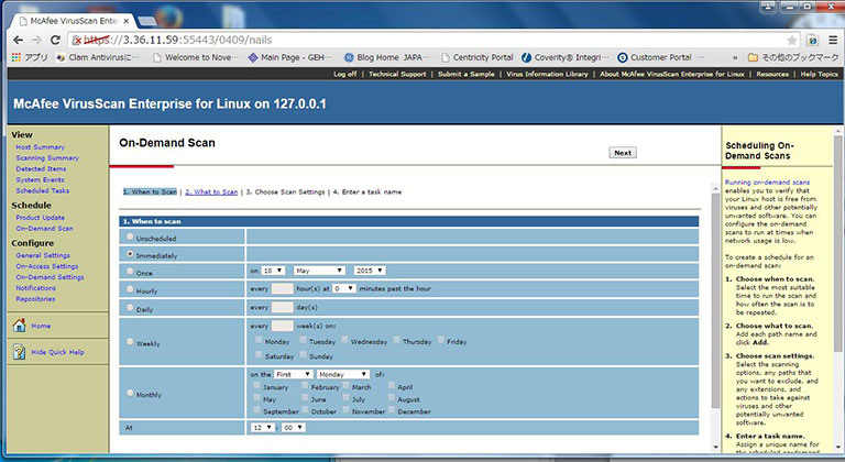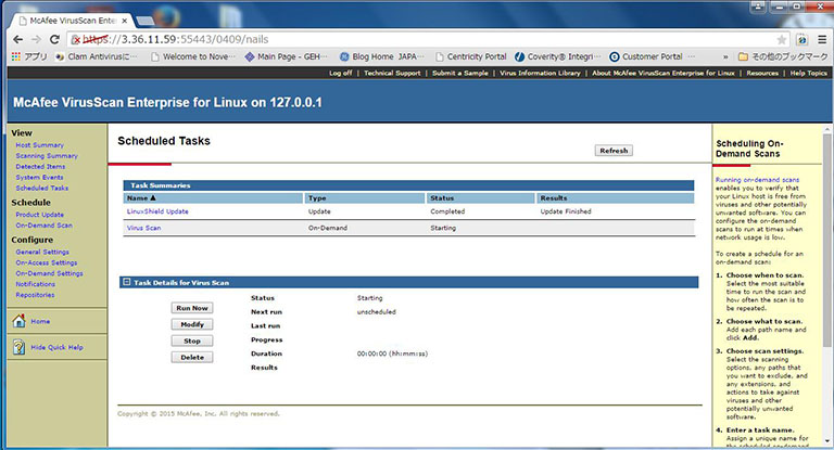 Note: On-Demand Scan will take 30-60 min (depending on system load and number of files) if scanning all files under the / directory. The scan will be aborted if the system is shut down or rebooted during the scan.Virus scanning may affect system performance and scanner operation. Do not run a virus scan during MR scanning activity. Query virus scan results using ePO.