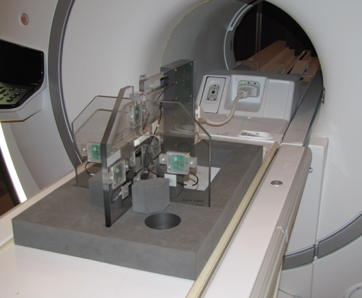 Discovery MR750 3.0T System Service Methods 5690009-2EN Revision 4 Object ID: 00000018WHA30999BGYZTopic ID: id_2002113 Version: 11.6Date: Nov 3, 2021 11:31:25 AMSetting up grafidy hardware ProcedureUnfold the six-channel Grafidy fixture and lock the arms into place (90° from center plate). Note: Make sure the six-channel Grafidy fixture is firmly pushed into the slit of foam support without any gap. Connect the P-port cable to the T/R board and secure with screws. Place the fixture at the front of the table with the connection box toward the bore.Connect the A-port connector to the A-port on the LPCA.Figure 1. Grafidy hardware setup for tableCenter the laser cross hairs on top of the fixture.Landmark the system and press Advance to Scan.