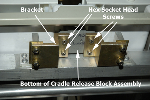 This procedure explains how to adjust the cradle release block position and how to adjust the cradle release block retraction. The cradle release block retraction procedure shows how to adjust the cable to meet the system specification.