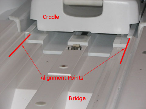 This dock adjustment procedure is required to properly align the cradle to the bridge in both the Z and X directions. Proper dock alignment ensures smooth travel of the cradle and protects table components from premature wear.