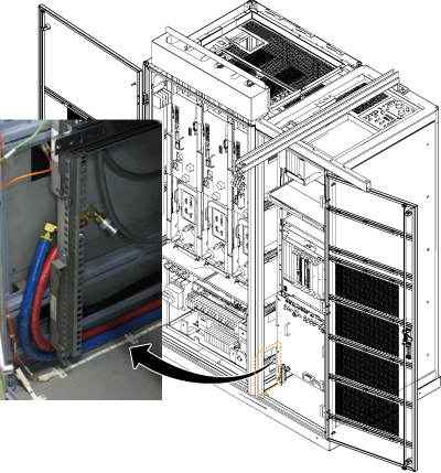 30. Note: Before the next step, prepare to absorb any leakage from the coolant lines by having a towel in hand as the line is connected. If any coolant leaks onto the white leak sensor strips under the RF amplifier, dry it thoroughly to prevent tripping the PDU rotary main breaker.