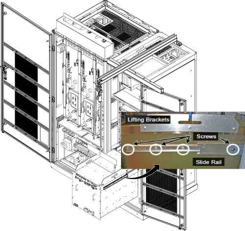 10. Attach the lifting brackets to both sides of the dual drive RF amplifier. The lifting brackets can be found in the dual drive RF amplifier FRU crate. The attachment screws are captive screws and remain with the lifting brackets.