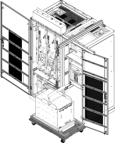 19. Roll the removed dual drive RF amplifier to the side. Later, it will need to be purged of water coolant before being packaged for return.