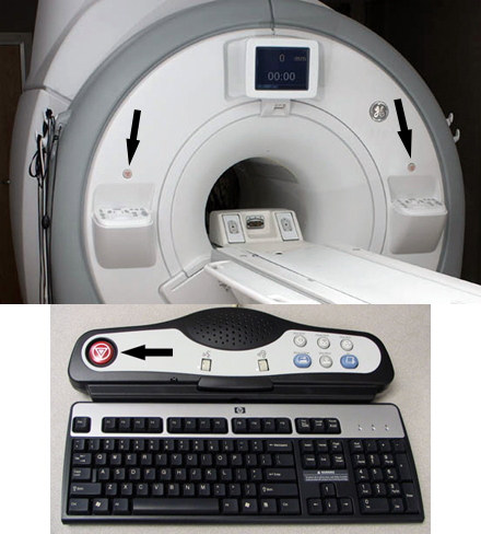 The PDU EMERGENCY STOP buttons are located on the Operator Workspace Keyboard and on the Magnet Enclosure front cover (two buttons, left and right). A SYSTEM OFF button is located on the System Main Disconnect Panel.