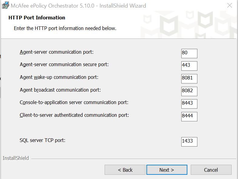 In the HTTP Port Information step, review the port assignments and click Next. Make sure the assigned ports are not already in use. You can change some of the ports now, but after the installation is complete only the Agent wake-up communication port and Agent broadcast communication port can be changed. See the example below (your ports might differ).