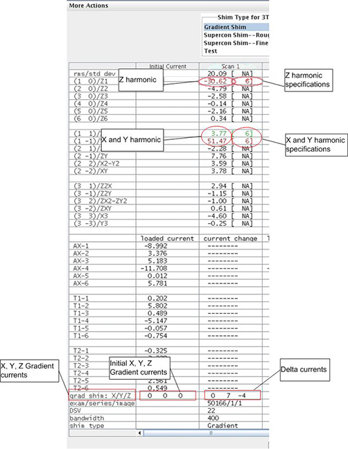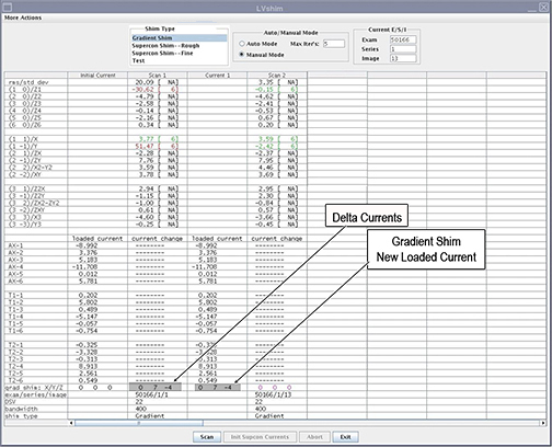 In Auto mode, gradient currents are automatically calculated after you click Scan to fine tune the homogeneity of the magnet. In this mode, the tool stops after the X, Y, and Z harmonics are within specification. In Test mode, the image from the last scan is automatically reanalyzed.
