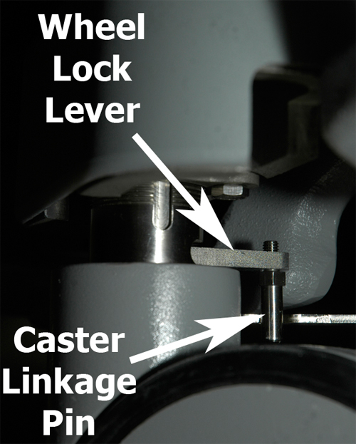 Although all four casters look identical on the outside, there is one notable difference when observing each caster assembly inside the caster covers. The patient table front left caster is known as the steer lock wheel, and its caster assembly design has a triangle-shaped bracket that differs from the other three casters.