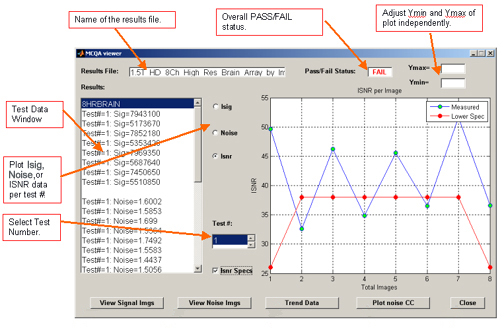 Every time a MCQA test is completed, a new results file is generated. Past MCQA results are stored on the system, which allows for trending of ISNR data over time. These results can be graphically trended using the MCQA Trend Viewer. All the files available for trending are listed in the Results Files window at the left.