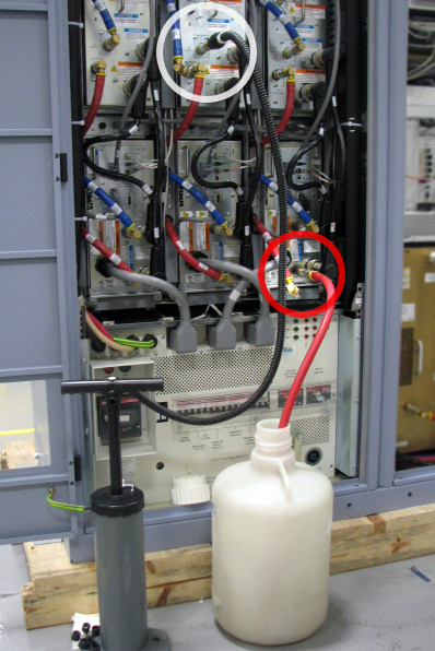 - Ensure all previously closed coolant valves are now open. Turn on the PPMP CB at the HEC. Start the pump by pressing ▲+F3 simultaneously. Air will push through the HEC reservoir as coolant fills the modules in the PGR cabinet. Add the required amount of coolant to the PE tank in the HEC to get the level about 3 to 5 inches from the top of the tank. Check the ball valves in the hoses, connections at the top of the PGR, and all quick-disconnects in the PGR cabinet for leaks.