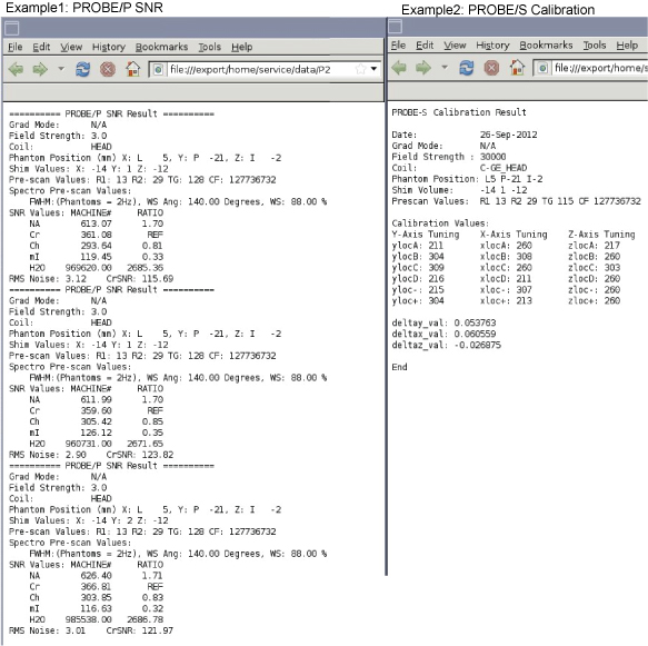 The probeTune tool also generates log files, which can be viewed from the tool or manually. There are four log files (one for each probe calibration and SNR check). The log files are stored in /usr/g/service/data and are named to indicate which test they result from (for example, *****_CAL.PRB and *****_SNR.PRB). There is no need for data sheets as in previous probe tuning applications. The files are always on the system, and saved on the SaveInfo media (if SaveInfo is performed after calibrations).