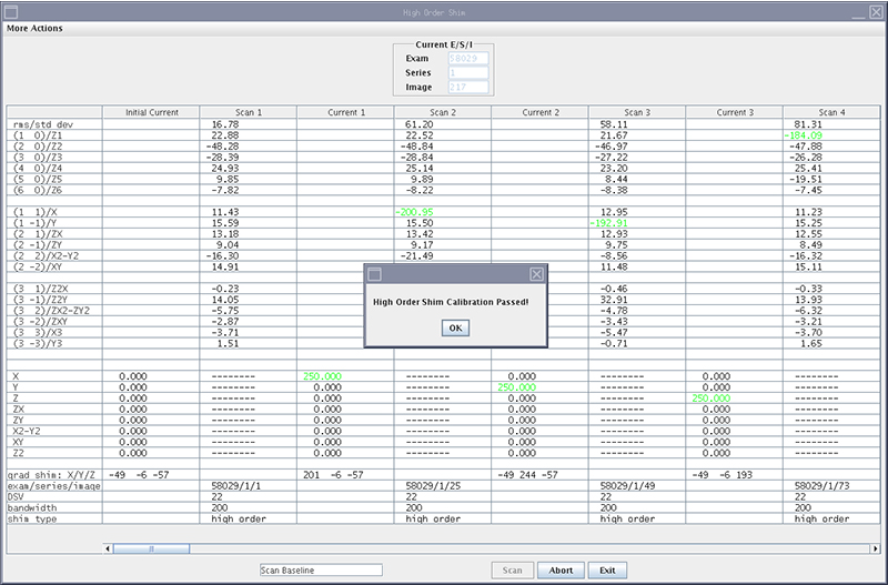 When the scan is complete, a dialog box appears. If the calibration is successful, the values show in green and a dialog box appears indicating High Order Shim Calibration Passed.