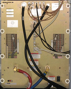 - Note: Before continuing, be prepared to absorb any leakage from the coolant lines with a towel in hand as the line is disconnected.Disconnect the cables on the front of the XRFD, and disconnect the coolant lines. Carefully move the cables and lines to the side of the cabinet, so the surrounding area is free from any obstruction when the amplifier is pulled out.
