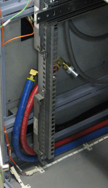 - Note: Before continuing, be prepared to absorb any leakage from the coolant lines with a towel in hand as the line is connected.Reconnect the cables and coolant lines to the XRFD. For the power cable, use the tie wraps along the inner edge of the cabinet and along the top so that the cable is safely out of the way.