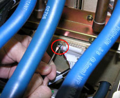 Note: Before continuing, be prepared to absorb any leakage from the coolant lines with a towel in hand as the line is disconnected. - Disconnect the power cable at the terminal, the cables on the