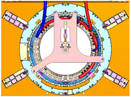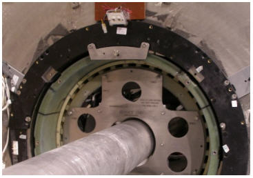 - At the patient end of the magnet, attach the XRMB radial alignment tool (5266408) to the magnet interface ring at 0° (top) using M10 studs and nuts. (See Figure 36.)
