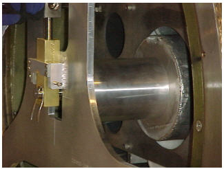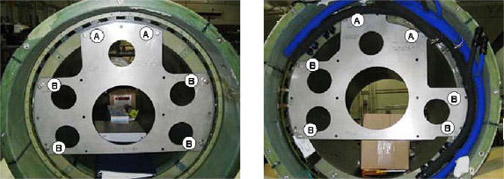 - Slowly push the XRMB into the magnet bore while watching the clearances to the left, right, top, and bottom. Adjust the tube jack and support plate mounting bearing as required to keep the gradient coil from touching the magnet bore surface.