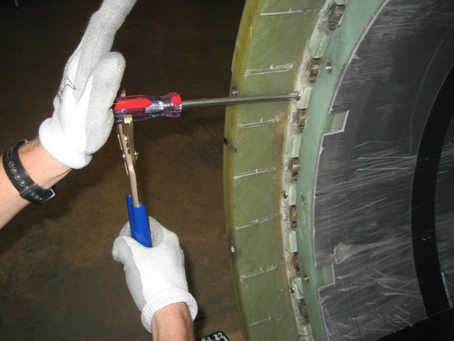 Using non-ferrous Phillips screwdriver and non-ferrous channel lock pliers, remove the 6 stainless mounting screws on the segment of the ring to be replaced.