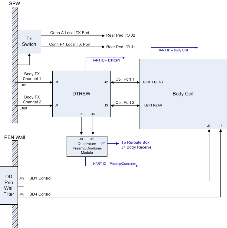 The dual transmit switch (DTRSW) contains the body TR circuitry needed to properly route the transmit and receive signals and to protect the body preamps and combiner assembly from signal overload. It does not contain quadrature phase shifting circuitry because this function is performed by the 3.0T DTX1 exciter.