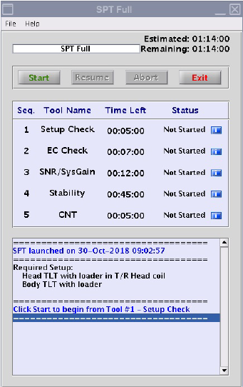 If you click the Abort button from the SPT Full tool, this will stop the subtool that is currently in progress. The Exit button becomes active on the subtool interface. If you select Exit, the Resume button becomes active on the SPT Full interface. If you select the Resume button, this will restart the subtool that was in progress when you aborted, and the full SPT test continues.