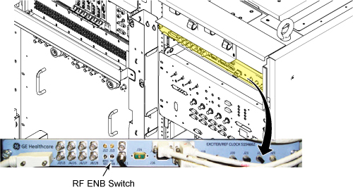 - On the exciter/ref clock module located in the Pen or ISC cabinet, set the RF ENB switch down (Disable).