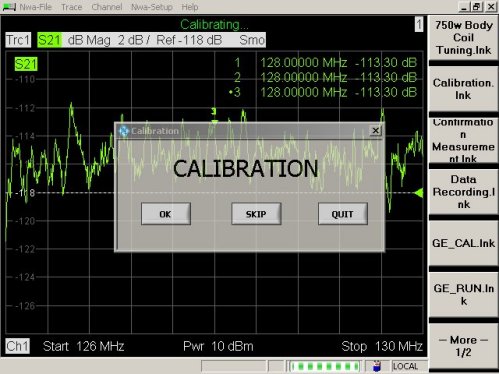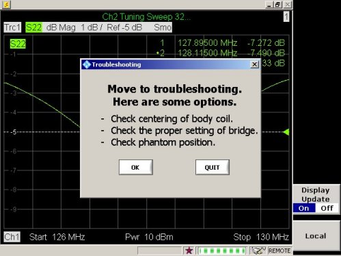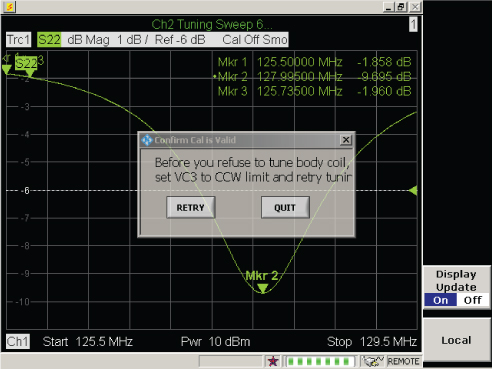 - From here, display on the network analyzer will navigate the operation. Follow the instruction shown in the display of the network analyzer.Note: If the body coil is within specification, a pop-up which is shown in Figure 36 will appear. You are done tuning.