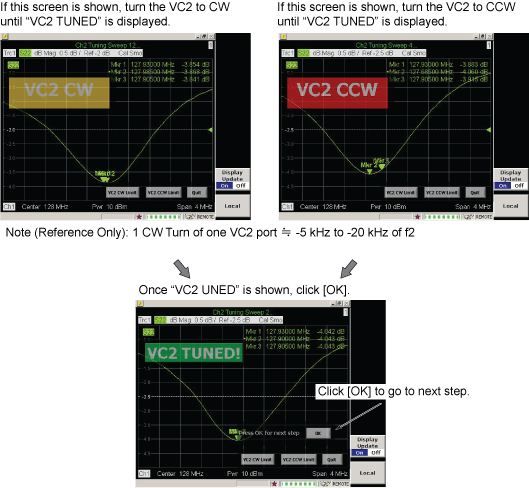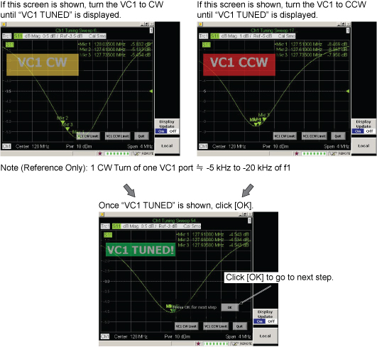 If VC1 CW or VC1 CCW is shown, turn VC1 using stick to tune f1 until [VC1 TUNED!] is displayed. Once [VC1 TUNED!] is displayed, click [OK] to go to next step.