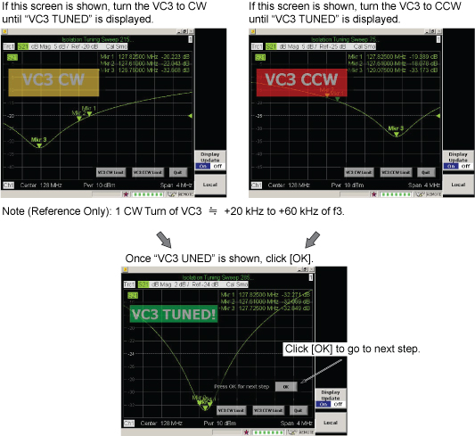 If VC3 CW or VC3 CCW is shown, turn VC3 using stick to tune f3 until [VC3 TUNED!] is displayed. Once [VC3 TUNED!] Is displayed, click [OK] to go to next step.