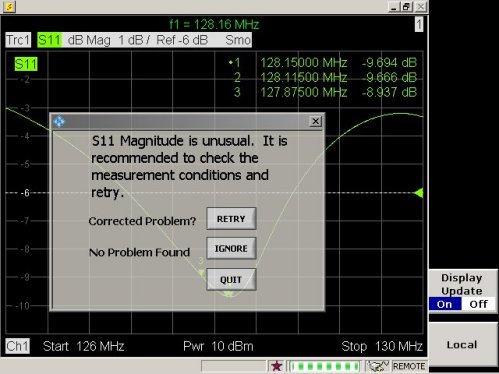 Note: In case the following screen comes up, it means S11 Magnitude is unusual.Figure 24. Message for unusual S11 Magnitude
