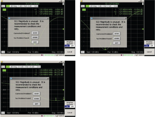 Note: If VC3 Tuned does not display even though tuning is performed according to the displayed instruction, select [VC3 CW Limit] or [VC3 CCW Limit] and start VC1 tuning per displayed instruction. If the VC1 Tuning and VC2 tuning are completed properly, the dialog box shown in Figure 34 will display. Turn the VC3 to CCW limit according to the displayed instruction and select [Retry]. Then, VC3 adjustment will be available.Note: In case the following screen comes up, it means S11, S22, or S21 Magnitude is unusual.Figure 33. Message for unusual S11, S22, or S21 Magnitude