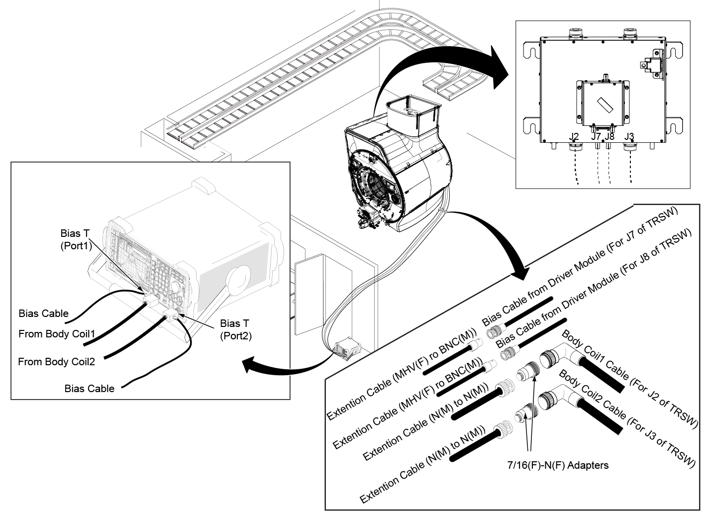 Table 5. Cable removed from TR switch Extension Cable Connector Body Coil/Bias Cable J2 N(M) N(M) Body coil 1 cable J7 MHV(F) BNC(M) Bias cable from driver module J8 MHV(F) BNC(M) Bias cable from driver module J3 N(M) N(M) Body coil 2 cable - At the network analyzer: