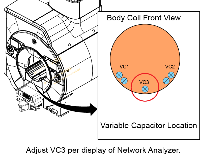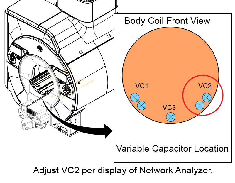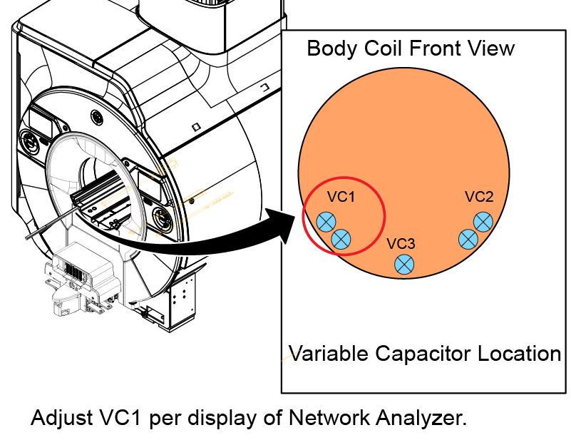 Body Coil Tuning is performed by adjusting Variable Capacitors (VC1, VC2, VC3) to tune f1, f2, f3, and MagS21 according to the navigation of the Network Analyzer screen.