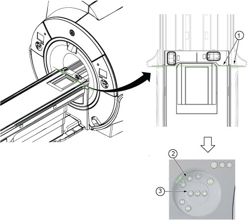 If the laser lights are aligned correctly, make a mark with a pen in the locations of the axial light and the saggital light, as shown in the figure. These marks will be the reference for future alignment light checks. After you make these marks, this procedure is complete.