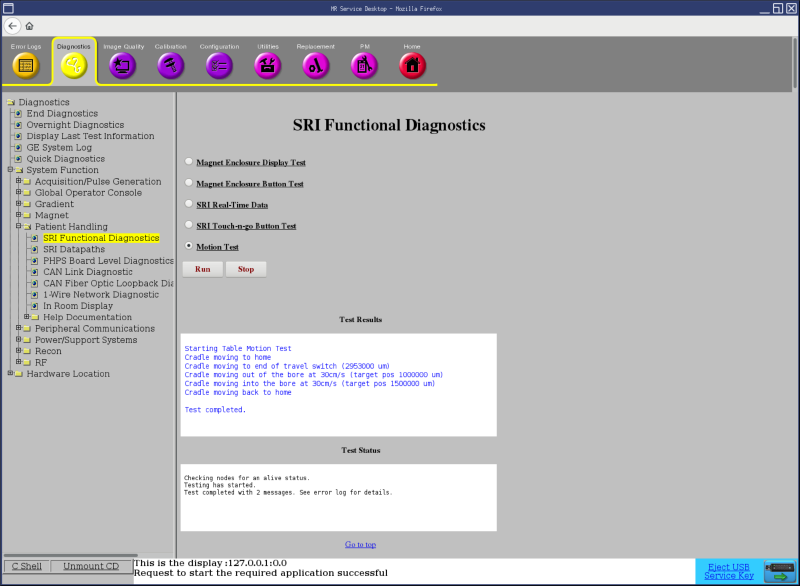 1. Select Diagnostics > System Function > Patient Handling > SRI Functional Diagnostics > Motion Test or Diagnostics > Hardware Location > Magnet Room > SRI Functional Diagnostics > Motion Test and then click Run.