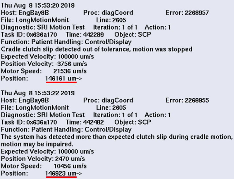 Note: The dockable table may produce the clutch slip error around the home location (150000 um ± 20000 um) as shown below. This behavior is expected and intentional. Note the position of the errors. Clutch slip errors at other locations (except near the home location 150000 um ± 20000 um) may indicate actual clutch slip problems.