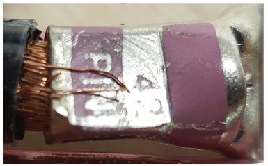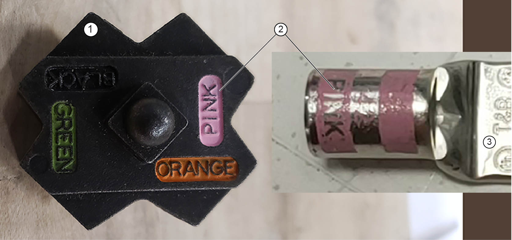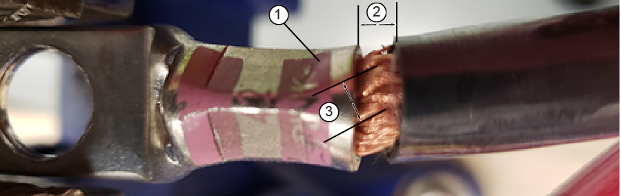 1 Barrel 2 Insulation to barrel gap (must be less than #3) 3 Two-wire bundle diameter - Put each lug in the die grooves of the crimping tool so the die is between the outer color-coded marks. Align each lug with the marks and crimp each lug onto the wires.Note: Use only the TBM5 or the TBM5-S supplied in GEHC Gradient Cable Tool Kit and the furnished T&B lugs.