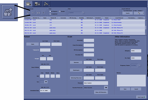 - To make sure of the connectivity of the system to the RIS system, click the [New Patient] icon in the scan desktop.