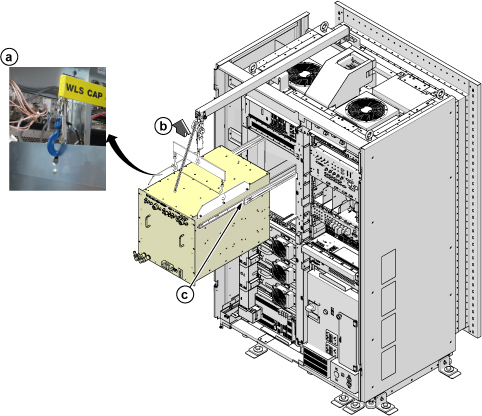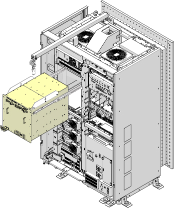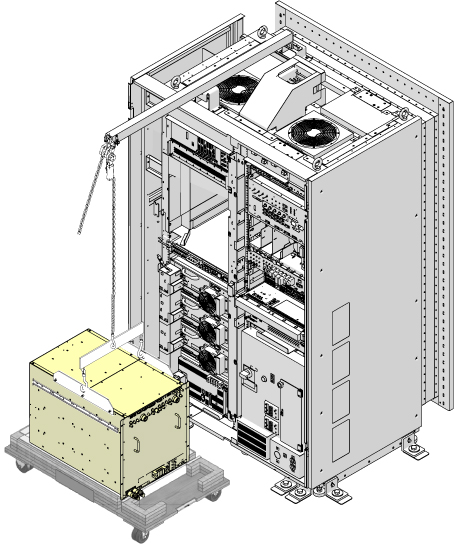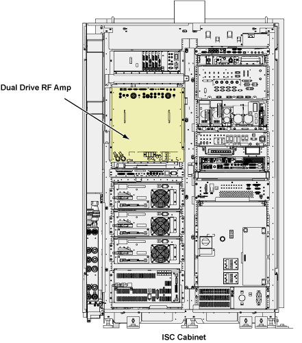This document contains Dual Drive RF Amp replacement procedure. This unit is in the ISC cabinet (shown below). The Dual Drive RF Amp unit is about 335 lbs (152kg). The unit weighs enough that the use of a hoist kit is required. This document details the correct way to use a hoist kit to remove the Dual Drive RF Amp unit and replace with the field replaceable unit (FRU) safely.