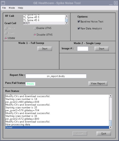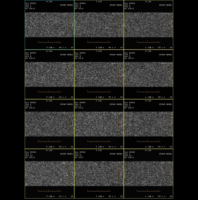Mode 1 creates 48 images while iterating on Readout Axis (X, Y, Z), (readout gradient fundamentals frequency), and placement of the data acquisition window over the attack "knee" and decay "knee" of the readout trains positive and negative lobes. In addition, Mode 1 generates various report fields and plot files that can be used to analyze white pixels. Mode 1 has been incorporated in the echo planar test (EPT) test to be run as a single test.