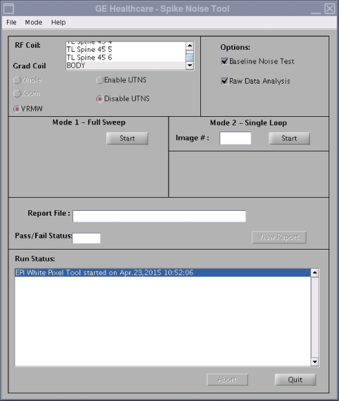This procedure uses echo planar image (EPI) scans and the raw data mode of recon to analyze the raw data for white pixel artifacts. These raw data artifacts can exhibit themselves as corduroy artifacts in images. There are two modes of operation for the EPI White Pixel Test.