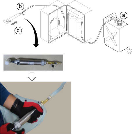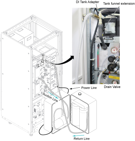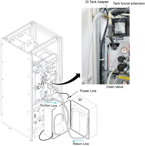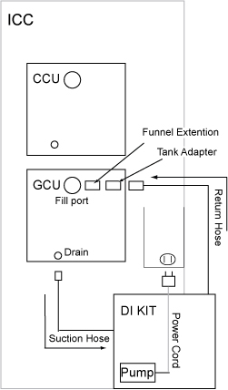 This procedure describes the process to deionize and filter the coolant for ICC cabinet. The Deionization Kit will hook-up to the cooling loop to increase the electrical resistivity level and to filter the coolant. Chemical additives will also be added back into each cooling loop. A general schematic of the setup for a cooling loop is shown below. Deionization can be performed while other planned maintenance tasks are being done in parallel since scanning is still allowed when the tool is hooked up and running.