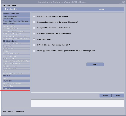 Note: The finalization step is selectable only if all of the required calibrations have been completed.