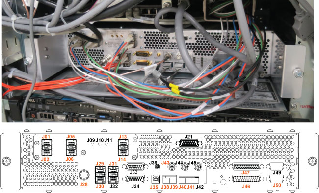 - Restore the clamps and tie wraps on the top of the ICE and connect the cables to the rear panel as shown below.
