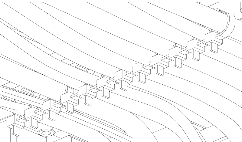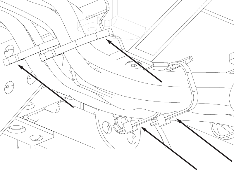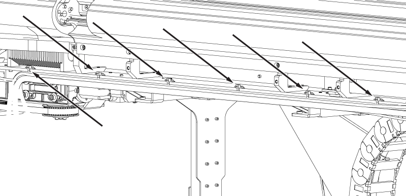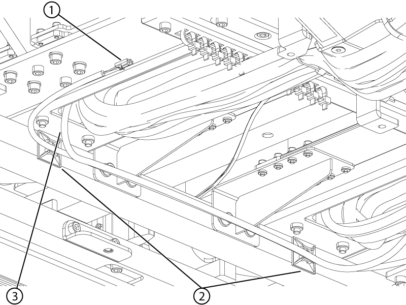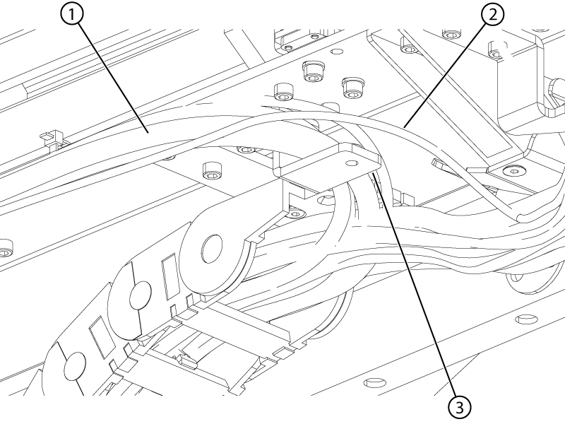 Route the slack of the cables exiting the top of the lower cable track forward and install four cable ties securing the cables to the cross-beam cable bracket. Install one cable tie on each half bundle at each end of the bracket.